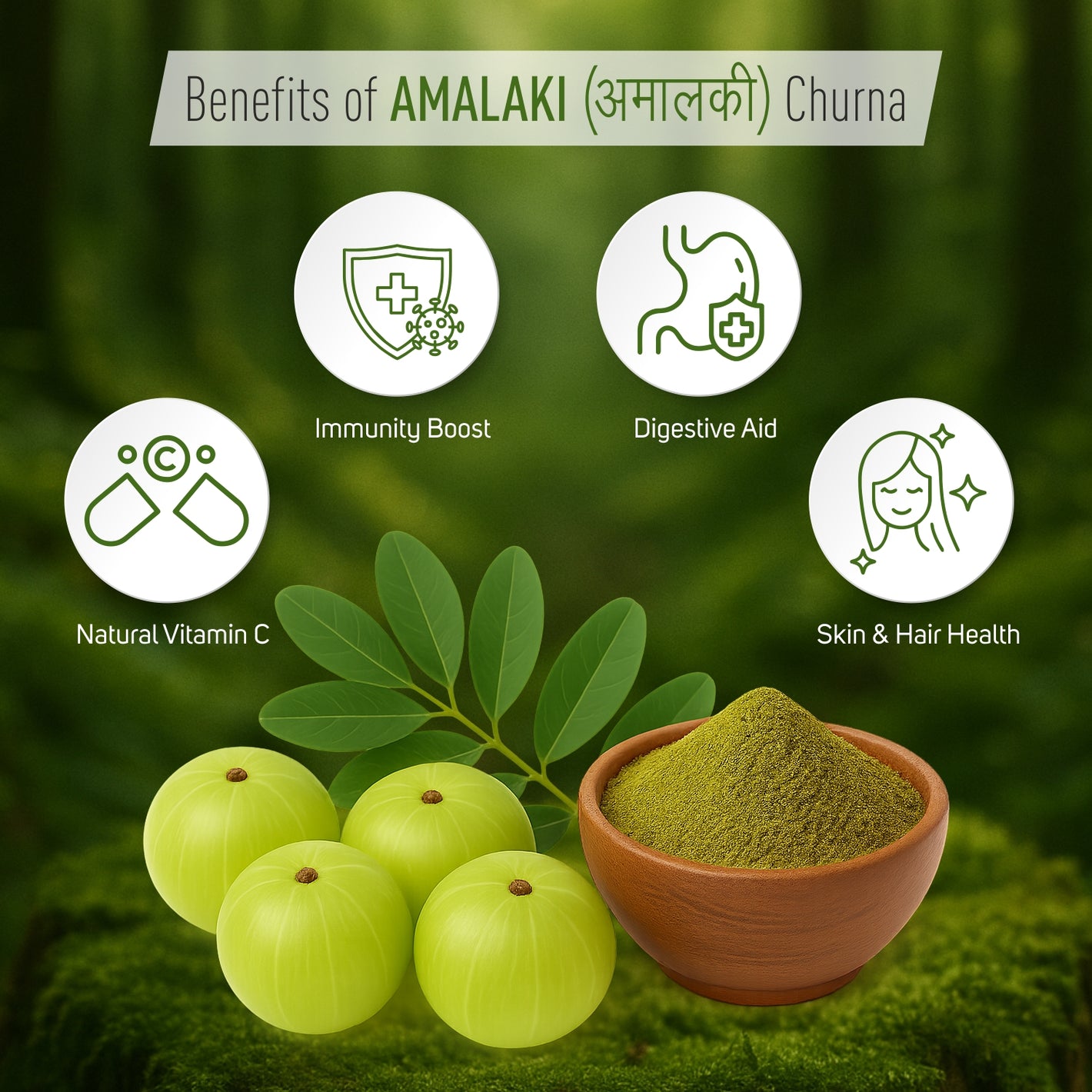 - 100% Pure Vegetal Amalaki (Amla) Churna – Sourced from the rich orchards of Uttar Pradesh, this churna is a natural powerhouse of Vitamin C, antioxidants, and essential nutrients.