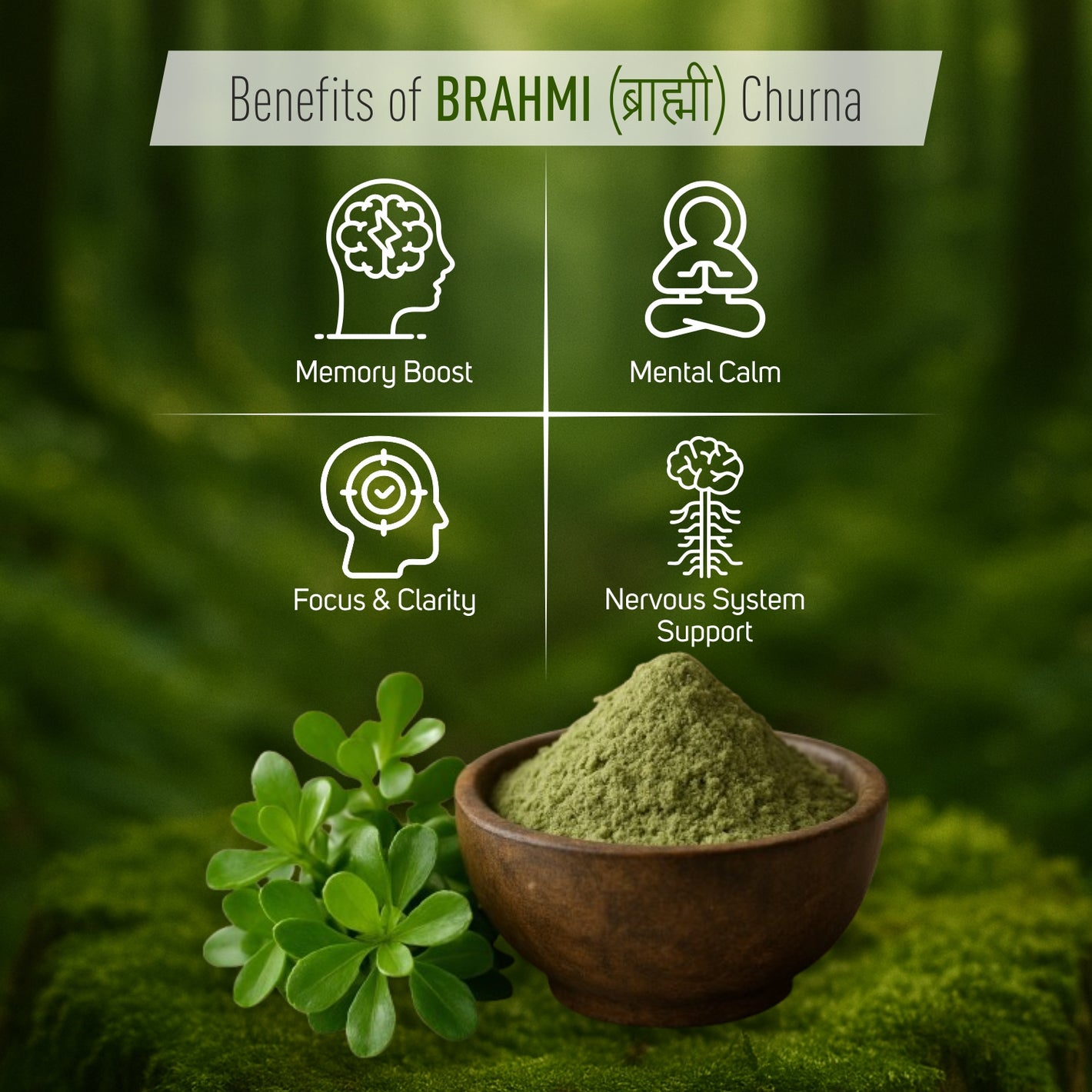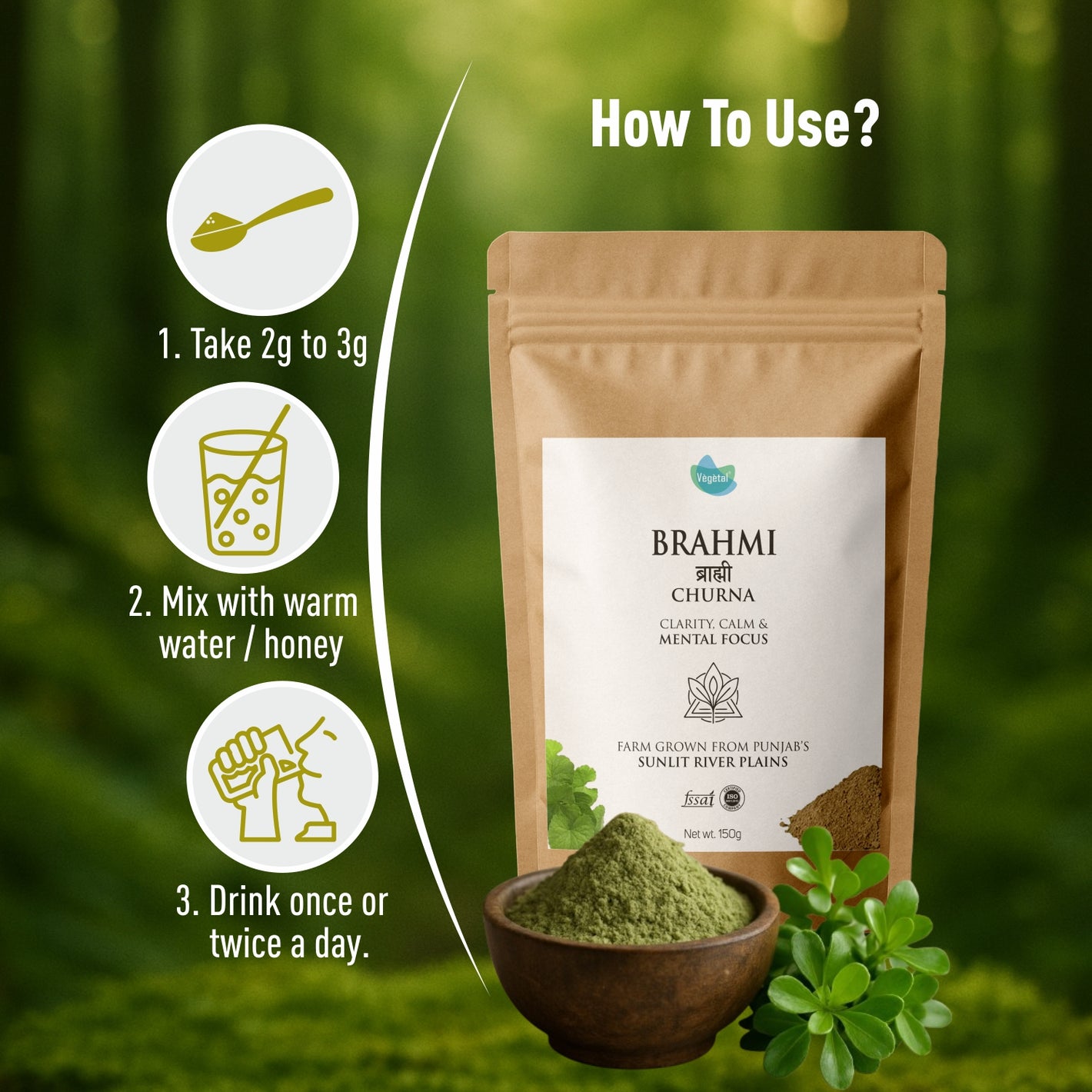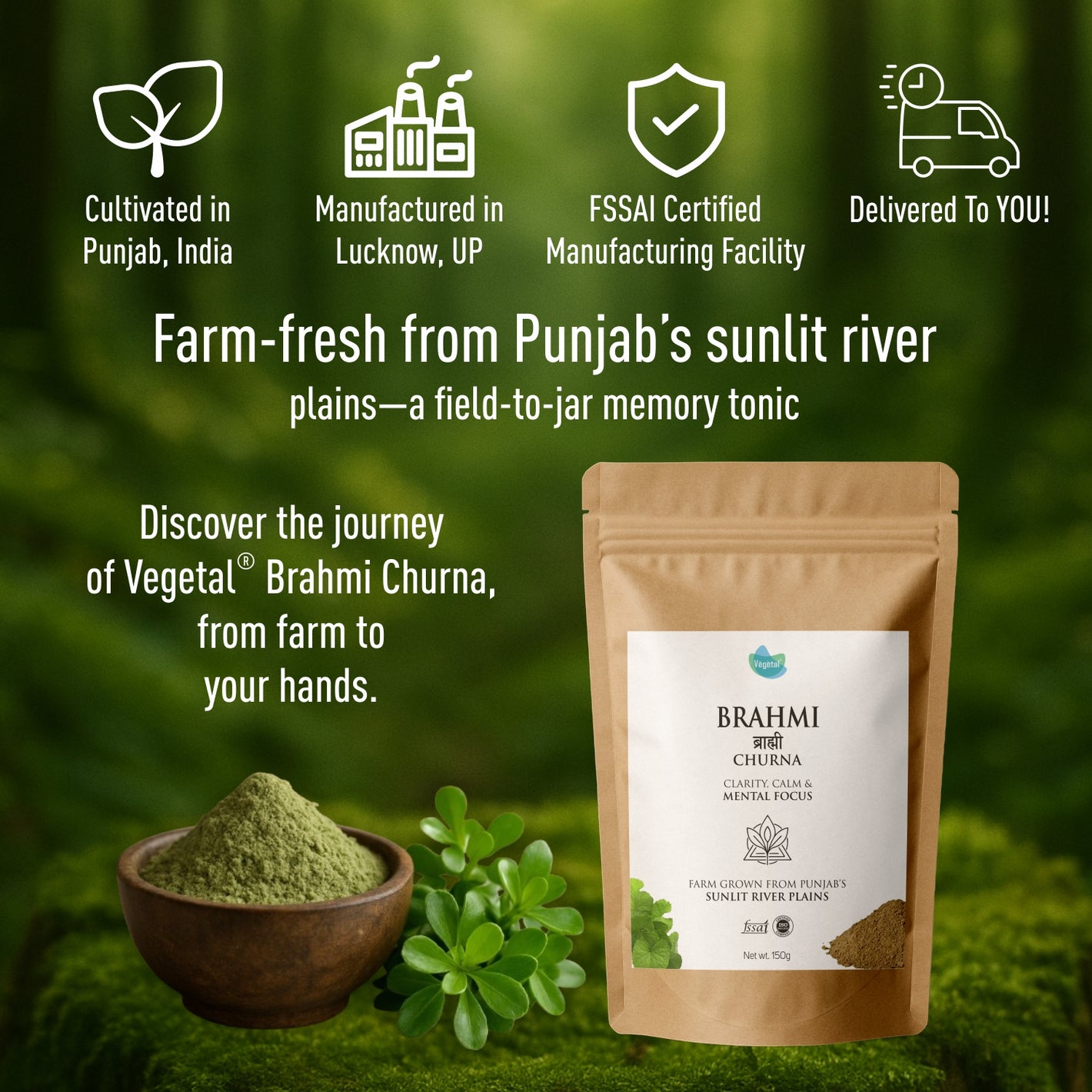 - 100% Pure Brahmi Powder – Made from farm-grown Brahmi (Bacopa Monnieri) from Punjab’s sunlit river plains, ensuring superior quality and potency