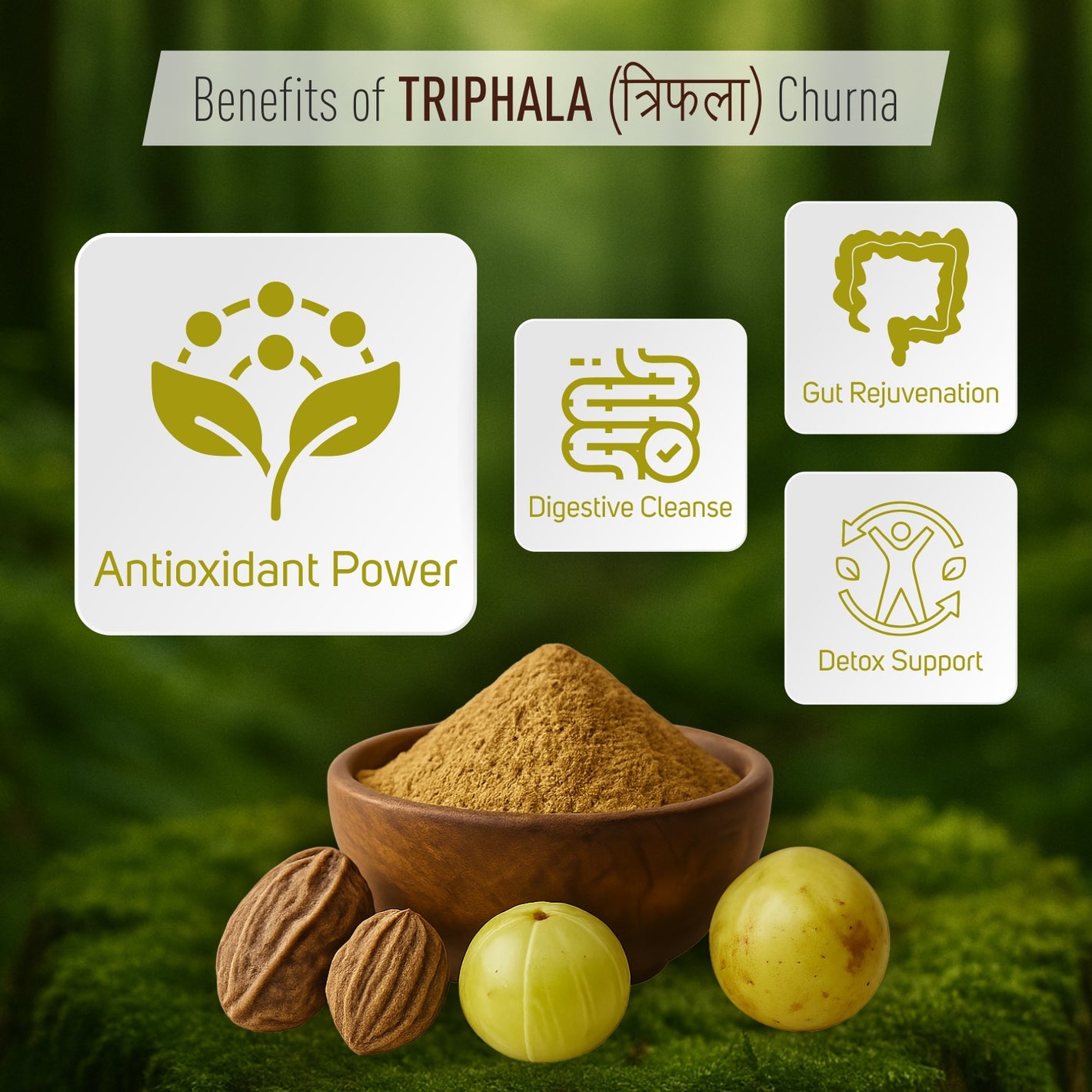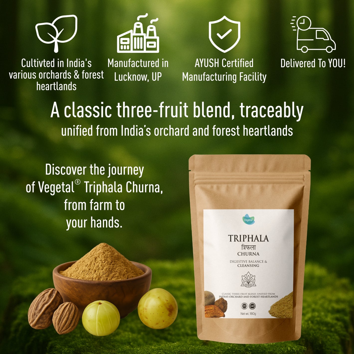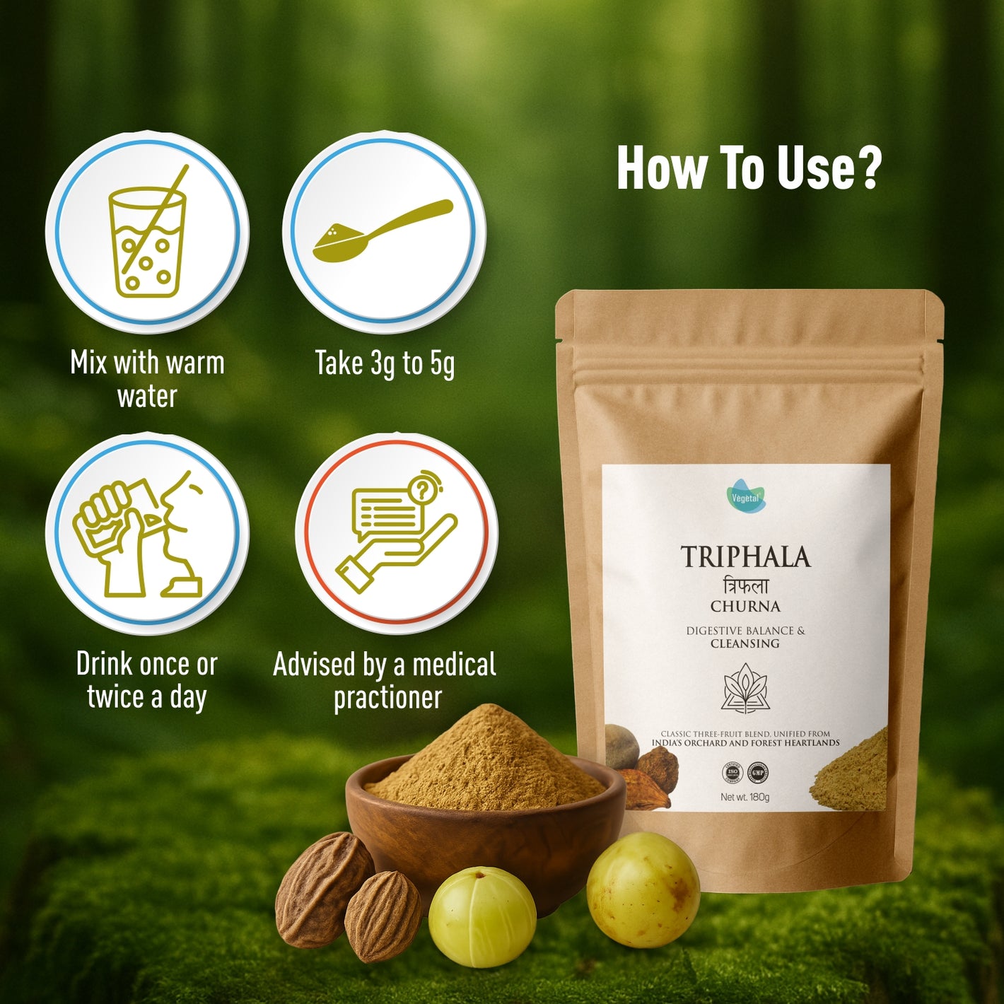 - Triple-Fruit Blend: This classic formula is made from three powerful fruits—Amla, Harad, and Baheda—in a traditional 1:1:1 ratio to ensure maximum efficacy.